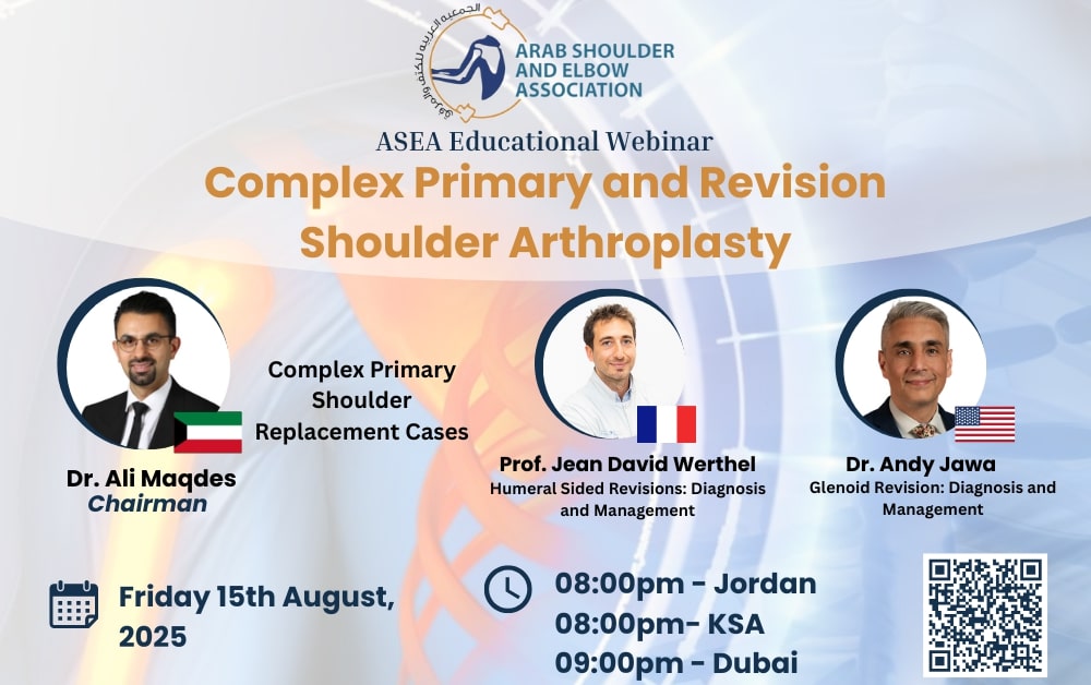 Join us for our upcoming ASEA Educational Webinar on Complex Primary and Revision Shoulder Arthroplasty, taking place on August 15, 2025. Chaired by Dr. Ali Maqdes (Kuwait), this session will feature expert insights into challenging cases, surgical strategies, and the latest evidence-based approaches in shoulder arthroplasty. The webinar is free to attend and open to […]